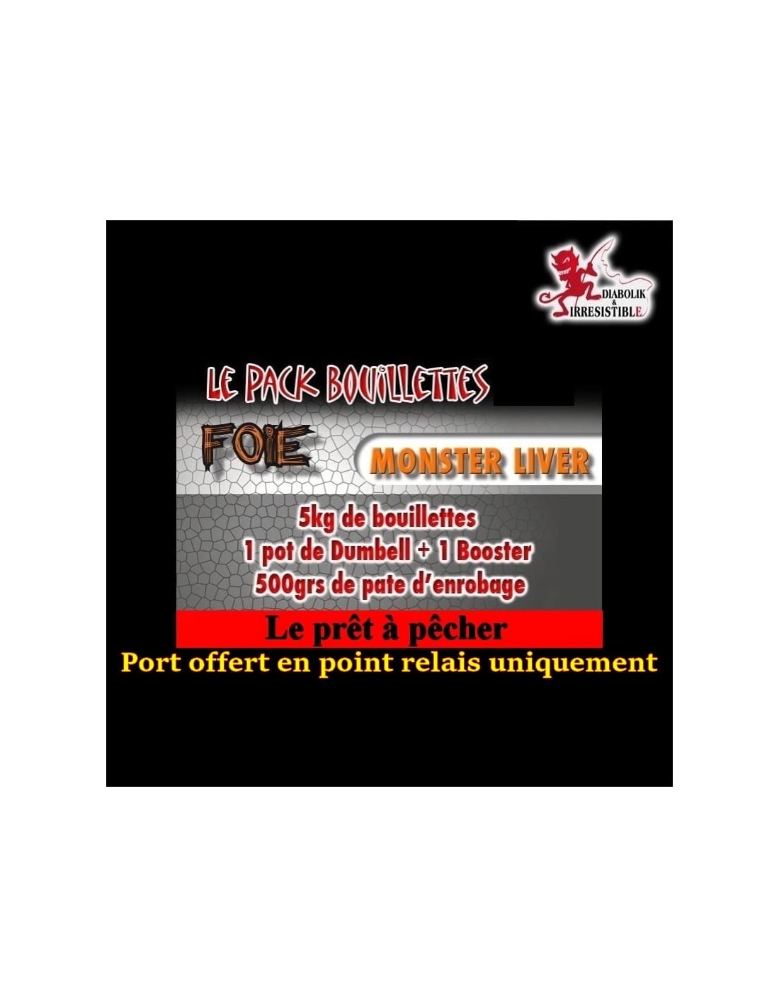 Pack comprenant: 5kg de bouillettes Monster Liver + 1 booster + 1 kg de method mix + 1 pot de dumbell monster liver.