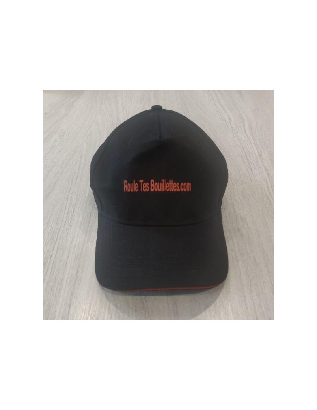Casquette noire avec lettrage et liseret rouge.